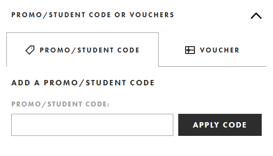 결제 화면 상단에는 “PROMO / STUDENT CODE OR VOUCHERS” 항목이 표시되며, 해당 영역에서 “ADD A PROMO/STUDENT CODE” 입력창을 확인할 수 있습니다. 이곳에 아소스 할인코드를 입력한 뒤 “APPLY CODE” 버튼을 눌러야 적용이 시작됩니다.