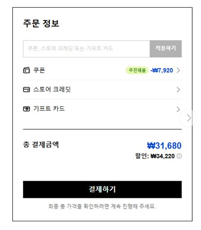 일부 경우에는 쿠폰 코드를 직접 입력하지 않아도, 조건이 충족되면 자동으로 할인이 계산되어 총 결제 금액에 반영됩니다. 이때 할인 금액은 주문 정보 영역에서 별도로 표시되며, 적용 전 금액과 적용 후 금액을 비교해 확인할 수 있습니다.